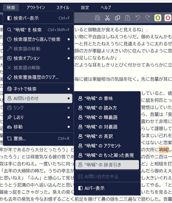 APIキーとモデル名に問題がなければ[AI問い合わせ]が使用可能になります。AI問い合わせを実行するには文字を選択し(※未選択の場合はテキストカーソル位置の単語が対象となります)、右クリックメニューの[検索|"対象文字"の 意味]以下のAI問い合わせ項目を実行してみてください。