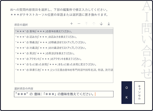 O's Editor3 から[AI問い合わせ]を行う際に使用されるプロンプト(AIへの質問文)は自由に変更することが可能です。メインメニュー[設定|ネット検索|AI問合せ内容の変更]を実行してください。ダイアログが表示されたら、一覧から項目を選択し、下部の入力枠で修正することができます。|(バーティカルバー)で区切られており、バーティカルバーの左側がメニューに表示される項目名、右側がAIに問い合わせる内容(プロンプト)となります。***の部分が選択文字またはテキスカーソル位置の単語文字に置き換わります。なお項目数は最大8までです。