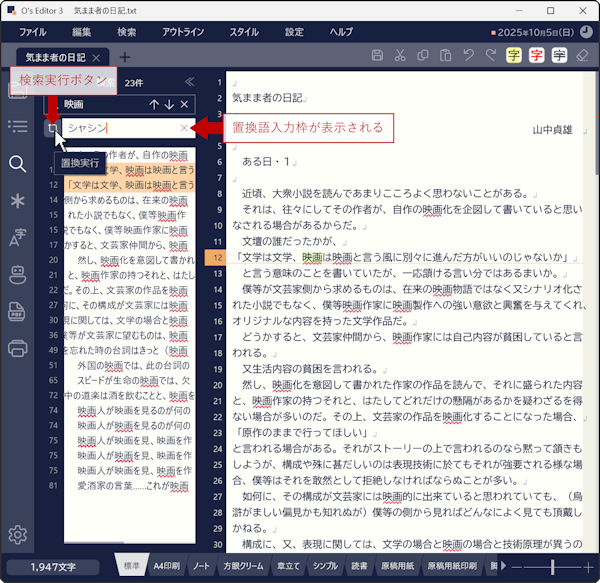 すると、検索語入力枠のすぐ下に置換語入力枠が表示されます。、左側の置換実行ボタンをクリックすれば、検索語を置換語に置き換えることができます。