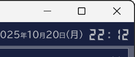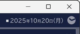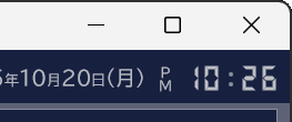 キャプションバーの右側にある日付のさらに右側に小さな24時間時計があります。文章を書くことを職業としている方々は昼夜逆転することも珍しくないでしょう。部屋に籠もっていると、今昼なのか夜なのかも定かではなくなることもあるかと思います。というわけで24時間時計です。上半分が昼、下半分が夜で、日の出日の入り時刻の変化によって昼夜の分量が変わります。三角の針は、昼は白っぽく、夜は黒っぽくなります(※スタイルによって色は変化します)。