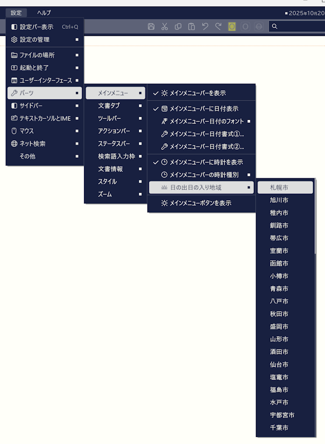 時計の表示非表示や時計の種別はメインメニュー[設定|パーツ|メインメニュー]から変更することができます。また日出日の入り時刻を算出するために地域をメニューから選択してください。