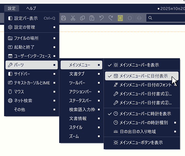 もちろん日付が煩わしければ、表示しないように設定することも可能です。メインメニューの[設定|パーツ|メインメニュー|メインメニューバーに日付表示]で表示するかどうか選択することができます。それ以外にも、日付のフォントを変更したり、日付の書式を変えることもできます。[日付書式②]はクリックした後の日付書式で、デフォルトでは年が元号になっています。