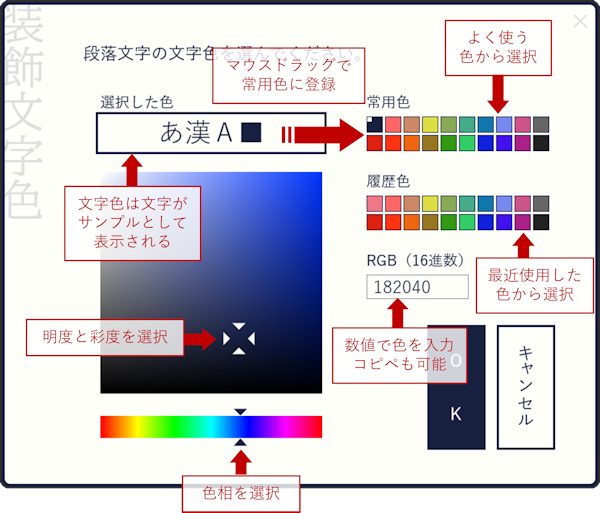 直感的に使用できるかと思いますが、常用色と履歴色から選べることも可能です。選択中の色を常用色にマウスドラッグすると常用色に登録されます。
