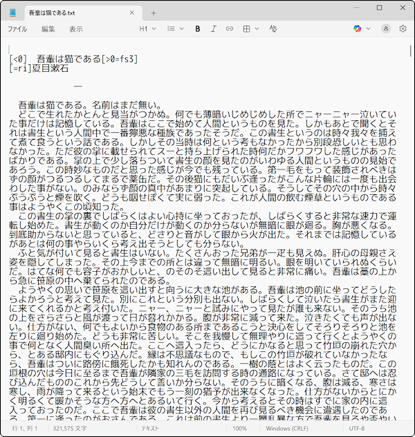 Editorは初期のバージョンからこの「青空文庫形式」のルビに対応してきました。文字を選択し、ルビボタンをクリックすればすぐにふりがなを入力するダイアログが表示され、簡単に青空文庫形式のルビを振ることができます。ちなみに小説では文字装飾が少ないと書きましたが、太字やフォント変更や傍点などを施す場合もあります。こうした文字装飾も