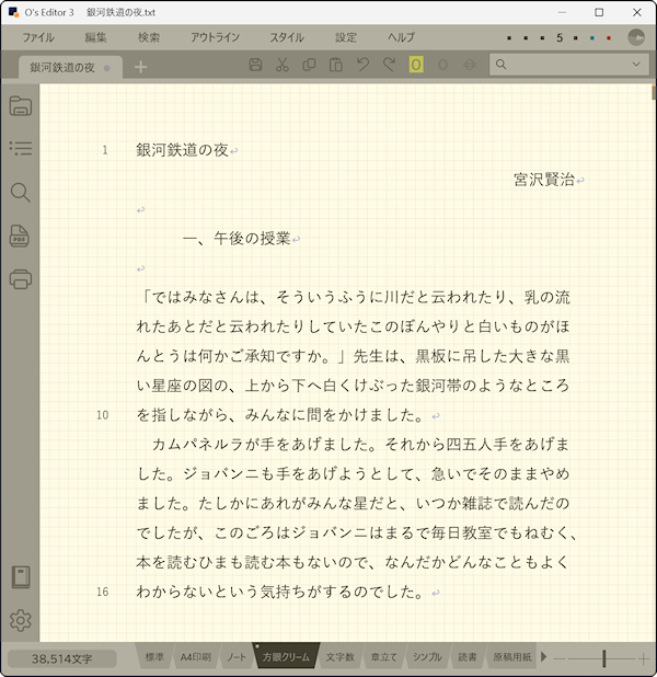 手書きの時代は皆思い思いの筆記用具で原稿用紙に文章を書いていました。デジタル時代になってもその文化の残照といえる原稿用紙スタイルは一定の需要があります。ただ、毎回原稿用紙スタイルで書きたいわけではない、という方も多いのではないでしょうか。そもそも小説のデータは文字のみですので、どのような体裁で執筆するか気分次第で変更できればなお良しです。O's