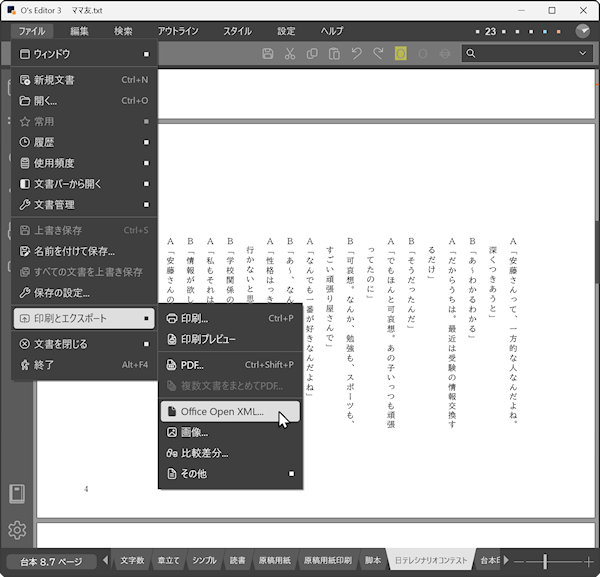 O's Editor3 のメインメニュー[印刷とエクスポート|Office Open XML]を実行します。