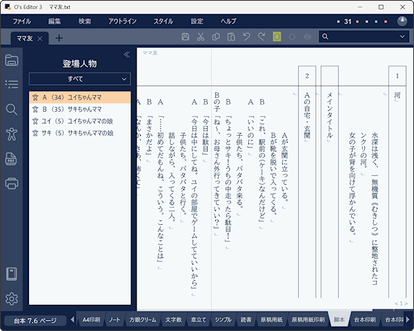 O's Editor3 では文書に紐付けられた情報を登録できるようになりました。登場人物や資料といった執筆に必要な材料を簡単に呼び出せるようになっています。メインメニューの[ファイル|文書管理|執筆材料|登場人物|登場人物の追加]や文書タブの右クリックメニュー[執筆材料|登場人物|登場人物の追加]で登場人物を追加登録しておけば、登場人物バーで一覧表示することができます。登場人物を登録しておくと、PDFエクスポートやOffice