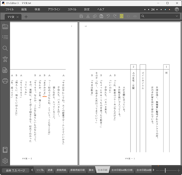 O's Editor3 にはあらかじめ脚本のためのスタイルがたくさん用意されています。“スタイル”とはフォントや色だけでなく折り返しなどの書式も含めた数多くの設定項目をワンクリックで変更できる O's Editor3 の代表的な機能です。スタイルを変更するには下部にあるスタイルタブをクリックするだけです。例えば[脚本]スタイルは柱に台本形式の罫線が施され、ト書きや台詞のインデントも自動適用される脚本執筆のためのスタイルです。[台本印刷]スタイルは映画やドラマの台本と同じ形式で表示編集印刷可能なスタイルです。脚本の文書を一つだけ作成すればスタイルを変更するだけでさまざまな体裁で編集することが可能なのが O's Editor3 の大きな特徴です。見た目は変わりますが文書自体は文字だけのシンプルなテキストファイルですので、他のアプリで開くことも可能です。