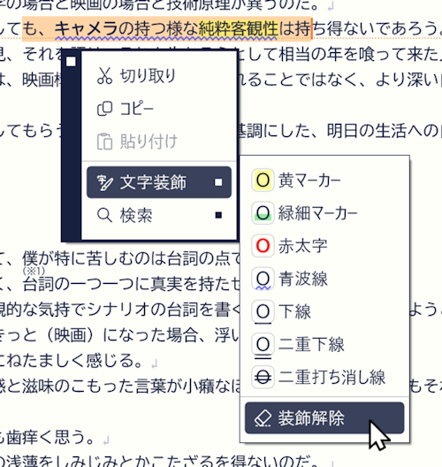 指定部分を重ねて実行することも可能です。例えば下記は青い波線を施しつつ重ねて赤字や黄色マーカーも指定しています。