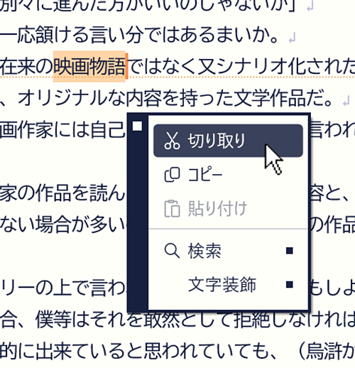 選択部分で削除するのではなく[切り取り]を行えば削除部分をクリップボードにコピーします。コピーした文字は別の部分に貼り付けることができます(※他のアプリにも貼り付け可能)。切り取りのショートカットキーは[CTRL]+[X]ですが、ツールバーのボタンや右クリックメニュー、メインメニューからも実行することが可能です。