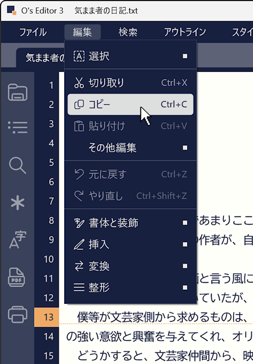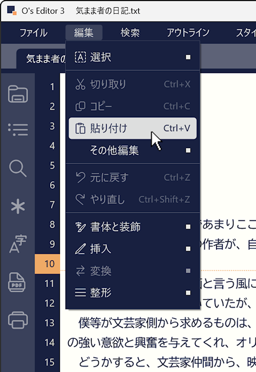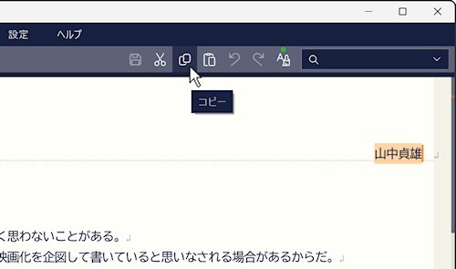 [コピー]も[切り取り]同様、ツールバー、右クリックメニュー、メインメニュー、そしてショートカットキーから実行可能です。クリップボードにコピーされた文字は他のアプリに貼り付けることができます。