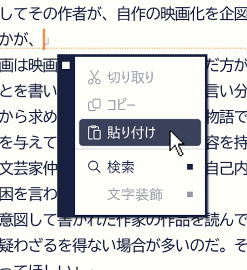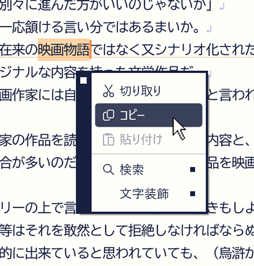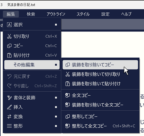 文字装飾が施された箇所をコピーした場合は、貼り付け時にも文字装飾が施されたまま貼り付けます。ただ、場合によっては装飾されていないプレーンなテキストを貼り付けたい場合があります。その時は[装飾を取り除いてコピー][装飾を取り除いて切り取り][装飾を取り除いて貼り付け][装飾を取り除いて全文コピー]を活用してください。