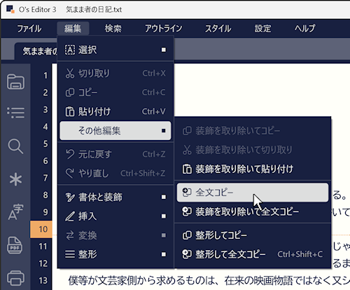 [整形してコピー][整形して全文コピー]という機能があります。これは主にO's Editor3で書いた脚本をワードに整形した状態でコピペしたいときに使われることを想定しています。実行すると折り返し部分に改行が挿入され、インデントも空白文字が補完されて、O's Editor3の画面と同じような状態でワードに貼り付けてることができます。