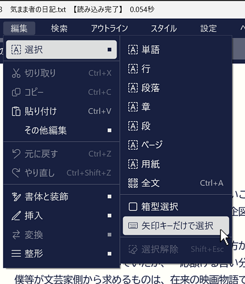 [SHIFT]キーを押しながら矢印キーを押すという操作が難しい方もいらっしゃるかと思います。その場合はメインメニューの[編集|選択|矢印キーだけで選択]を実行してください。矢印キーの操作だけで選択可能になります。解除するには[ESC]キーを押してください。選択メニューには他にも選択に関する項目があり、メニューから選択することも可能です。
