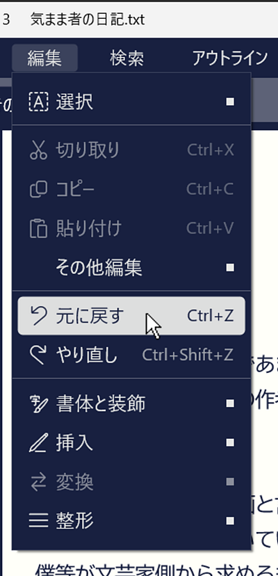 1文字削除といった単純な編集作業を連続で行った場合はまとめてアンドゥ登録されます。なので、1文字ずつ削除してもアンドゥを実行するとまとめて復活するようにしてあります。アンドゥ作業をブロック単位で記録するイメージです。 |