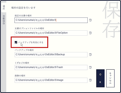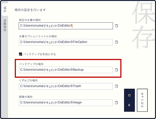 バックアップが有効になっているときに文書を編集して保存を行うと、自動的にバックアップファイルが作成されます。バックアップが作成されるのは同じ保存の設定ダイアログの[バックアップの場所]で設定されたフォルダです。