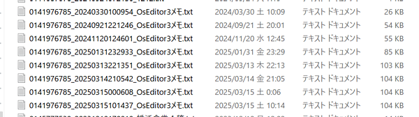 バックアップファイルは下記のようなファイル名になって保存されます。最初の10桁がファイルのID。アンダースコアを挟んだ次の14桁の数字が年月日時分秒。そしてさらにアンダースコアを挟んで元のファイル名となります。はじめにIDが付加されるのは違う場所で同じファイル名のときに区別できるようにするためです。中身はもとのテキストファイルですのでO's Editor3で自由に閲覧編集が可能です。