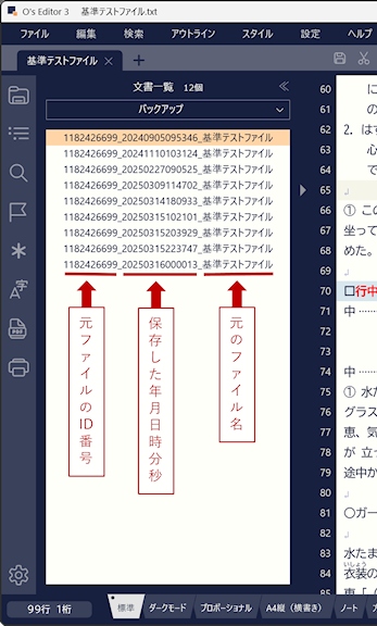 現在開いている文書のバッアクップファイルのみ一覧表示されます。バックアップファイルはID番号+保存日時+ファイル名で構成されています。ダブルクリックすれば即座に開くことができます。