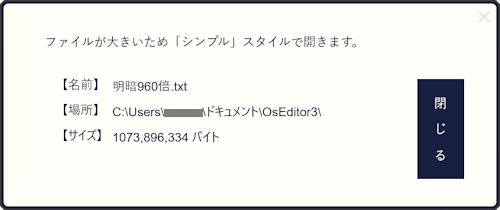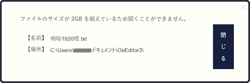 O's Editor3 で読み込めるファイルの大きさは2GBまでとなっています。2GB以上のファイルを開こうとすると、下記のような表示が出て開くことはできません。