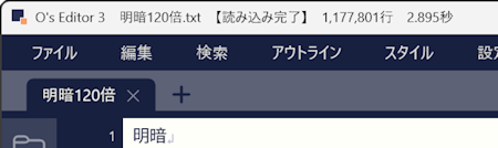 2GBに近い1000万行程度のファイルも一度開いてしまえば閲覧するだけなら快適です。ただし、編集作業となるとかなり動作が重くなります。O's Editor3 の開発にあたっては、巨大ファイルの動作確認用として夏目漱石の「明暗」を1800回コピペしたテキストファイル(UTF-8/1.9GB/シンプルスタイルで約980万行/標準スタイルで折り返し約1600万行)を使用しました。作者のパソコンだとこのファイルを開くのにシンプルスタイルで約10秒かかります(※下記がそのファイルを読み込んだときの様子です)。なお文字数カウントは別スレッドで動くため、「計算中...」のあいだも編集作業は可能です。下の動画では6億文字を超えています。