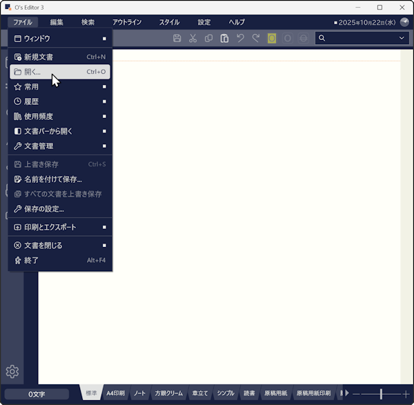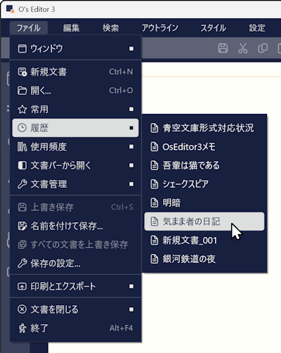 メインメニュー[ファイル|履歴]は過去に開いた文書を直近のものから順にリスト化されています。最近開いた文書はすぐに開き直すことが可能です。