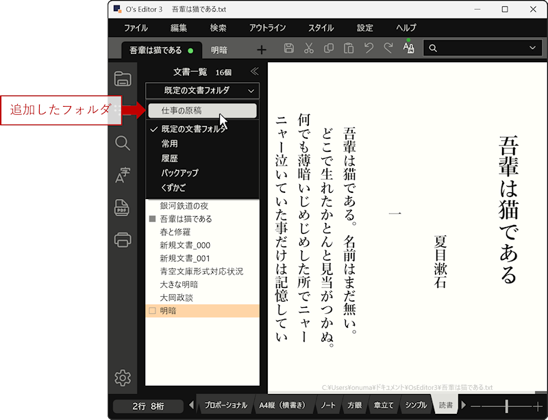 文書バーの上部にフォルダを切り換えるリストがあります。ここによく使用するフォルダを登録することも可能です。[規定の文書フォルダ]を変更するにはメインメニューの[設定|ファイルの場所|規定の文書の場所]で設定してください。よく使用するフォルダを登録するにはメインメニューの[設定|ファイルの場所|文書バーの追加フォルダを編集]を実行しダイアログで登録してください。