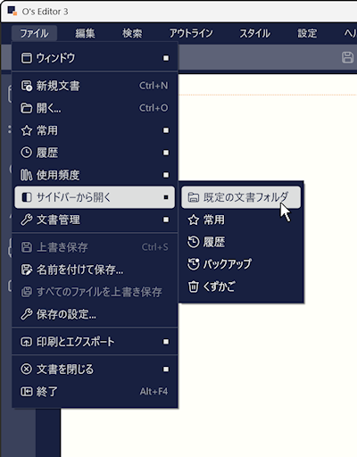 文書バーはメインメニューの[ファイル|サイドバーから開く]から表示させることも可能です。