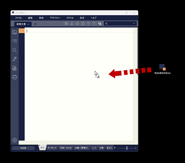 テキストファイルをO's Editor3にマウスドラッグすることで開くことも可能です。複数のテキストファイルをドラッグすれば複数開くこともできます。