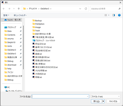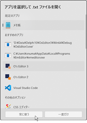 テキストファイルをO's Editor3に関連付けるには、Windows上のアイコンから開くには右クリックでコンテキストメニューを開き[プログラムから開く|別のプログラムを選択]をクリックし、[O's Editor3]を選択してから[常に使う]をクリックしてください。テキストファイルのアイコンを元に戻したい場合は関連付けをメモ帳にしてO's Editor3との関連付けを解除してください。
