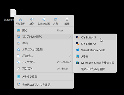 テキストファイルをO's Editor3に関連付けしていない状態でWindows上のアイコンから開くには右クリックでコンテキストメニューを開き[プログラムから開く|O's Editor3]を選択してください。