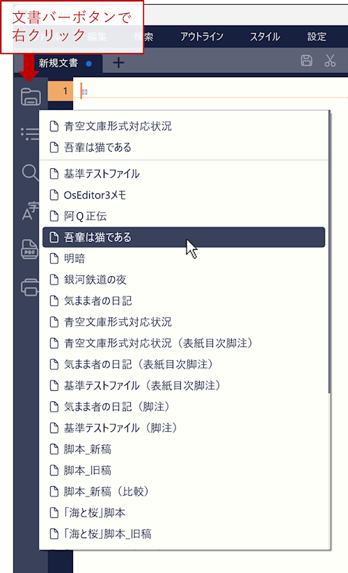 アクションバーの一番上にあるボタンをクリックするとサイドバーの1つである文書バーが表示されます。文書バーは「規定の文書フォルダ」や「バックアップフォルダ」、あるいはユーザーによって設定されたフォルダなどを選択し、そのフォルダに含まれる文書を一覧したものです。ファイル名から拡張子を除いた名前がリスト化されていますのでダブルクリックすることで開くことができます。すでに開いているファイル名の先頭にはマーク表記が付加されます。