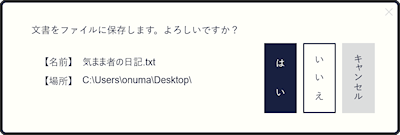 自動保存が有効ではない場合、保存を行わずにウィンドウを閉じると文書を保存するかどうか確認んのためのダイアログが表示されます。[はい]なら保存を実行し[いいえ]なら保存を行わずにウィンドウを閉じます。[キャンセル]を選択するとウィンドウを閉じずにそのまま編集作業を続行します。