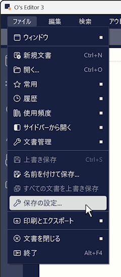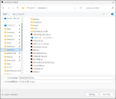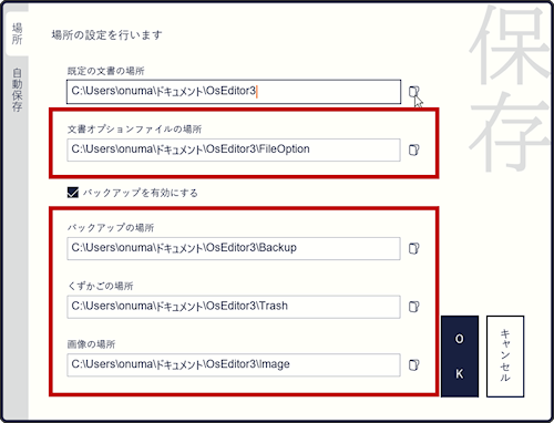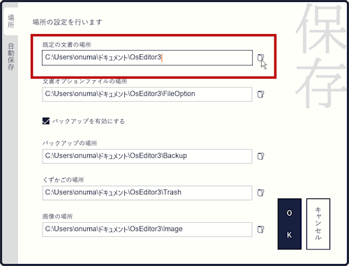 デフォルトで[規定の文書フォルダ]は C:\Users\(ユーザー名)\ドキュメント\OsEditor3\ となっていますが設定で変更することも可能です。メインメニューの[保存の設定]を実行してください。