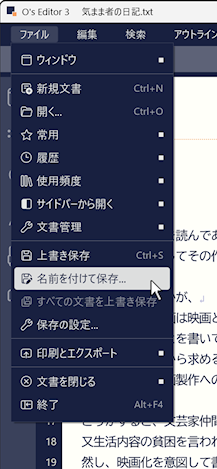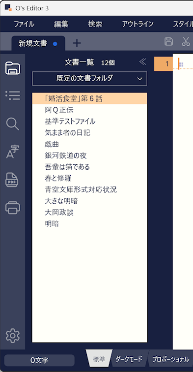 さて、文書(テキストファイル)はパソコン内の概ねどこにでも保存することができますが、O's Editor3はアクセスしやすい文書フォルダを決めることによって文書の場所を統一し一元管理することもできます。文書バーを表示すると一覧表示されるのはその[規定の文書フォルダ]にあるテキストファイルです。このフォルダに文書を入れておけば文書バーですぐに開くことができるようになります。