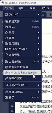 メインメニューから[上書き保存][名前を付けて保存][すべての文書を上書き保存]を選択して保存を実行することもできます。