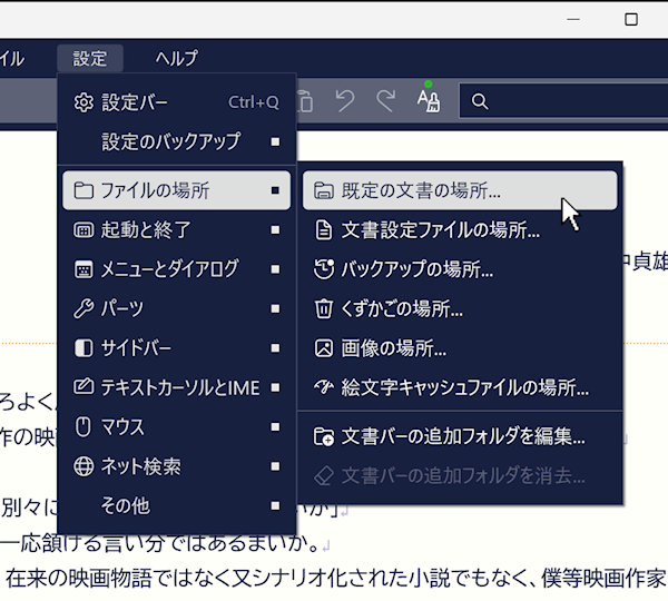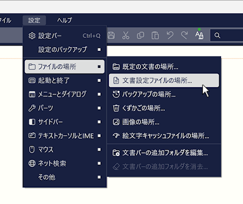 [規定の文書の場所]はメインメニューからも変更することが可能です。メインメニューの[設定|ファイルの場所|規定の文書の場所]を実行してください。