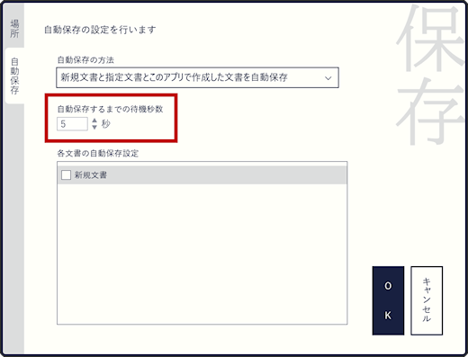 デフォルトでは自動保存までの時間が5秒に設定されています。変更する場合は秒数を入力してください。
