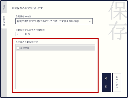 文書毎に自動保存するかどうかを決める場合はダイアログ下部に開いている文書が一覧表示されますので、自動保存する文書にチェックを入れてください。