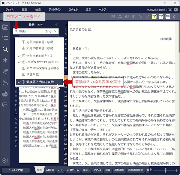 置換は検索バーでも行うことができます。検索バーの検索語入力枠内左側にある虫眼鏡ボタンをクリックし、検索メニューを表示してください。一番下の[置換語入力枠を表示]をクリックします。