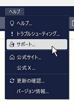 メインメニューの[ヘルプ|サポート]を実行するとサポートダイアログが表示されます。