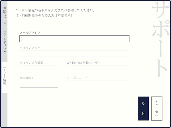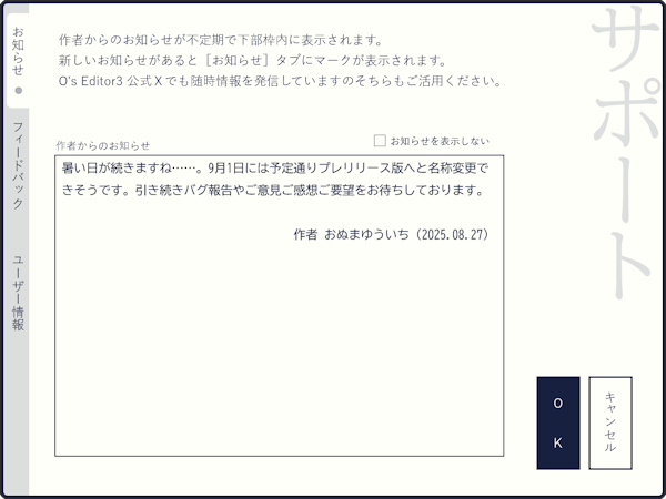 サポートダイアログでは作者からの[お知らせ]や、逆に作者へ意見や要望をなどを送る[フィードバック]、それに対する[作者から返信]、そして O's Editor3 を継続的に利用するために入力する[ユーザー情報]といった項目があり、それぞれタブを切り替えることによって表示させることができます。[お知らせ]は不定期に作者から送られる案内版です。作者から情報が送られると、お知らせタブの下に丸マークが表示されます。マークは3日経過すると薄い色になり、一週間が過ぎると消えます。[お知らせを表示しない]にチェックを入れるとお知らせをダウンロードして表示させることをやめることができます。