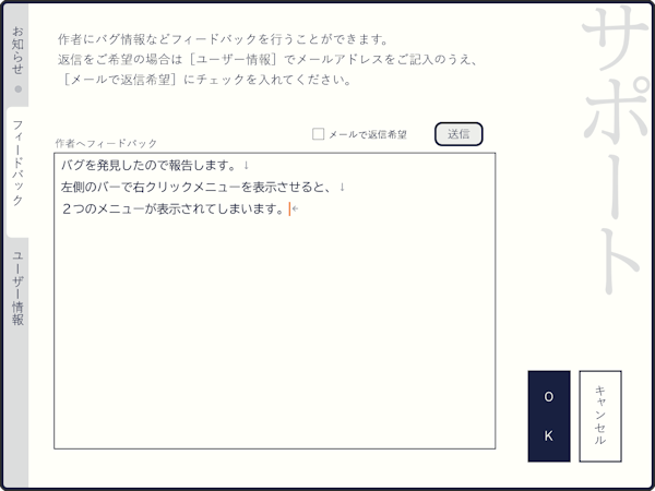[フィードバック]タブは作者に対して質問や意見、要望、バグ報告などを送るページです。枠の中に文章を書き、[送信]ボタンをクリックすれば作者に送られます。作者の返信をご希望の場合は[ユーザー情報]タブでメールアドレスをご記入の上、[フィードバック]タブの[メールで返信希望]にチェックを入れてください。