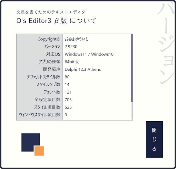 バージョン番号や対応OSなどのほか、開発環境も表示されます。O's Editor3 は Delphi を使って作成しました。Delphi は Pascal 言語を採用した歴史ある開発環境で、爆速コンパイルと厳密な静的型付けによるメンテナンスの容易さが特徴です。その愚直さが私は好きなのですが、さらに最近はコードをなるべく冗長に書くことを心掛けています。そうすることによって、時間が経ってもあるいは作者が高齢になっても、バグを発見しやすくまた改良をしやすくすることが可能になると思うからです。