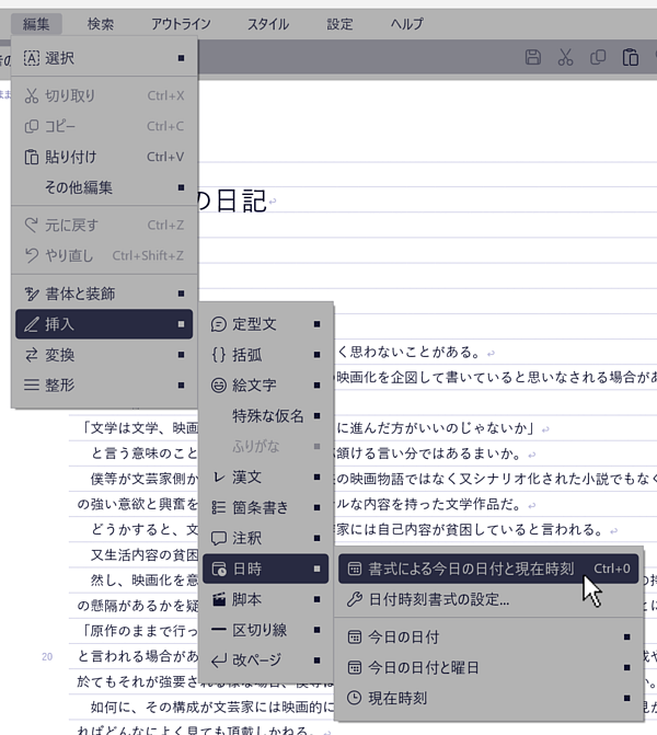 文章に日付と時刻をさまざまな形式で挿入することができます。メインメニューの[編集|挿入|日時|書式による今日の日付と現在時刻]を実行すると、デフォルトでは