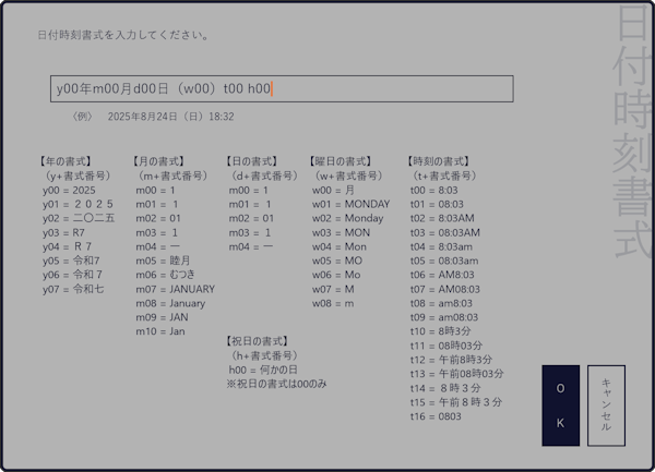 2025年8月24日(日)18:30 という標準的な書式で現在日時が挿入されます。