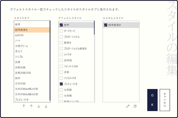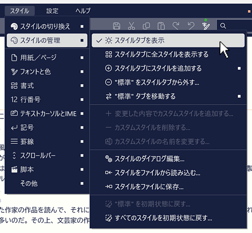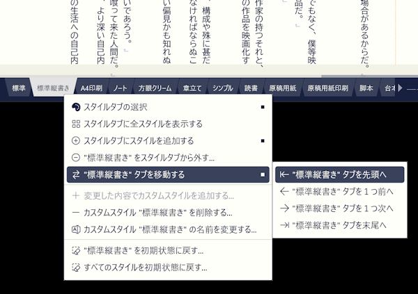 メニュー中段は独自に設定を変更したスタイル、カスタムスタイルに関する操作項目です。スタイルの設定を変更すると、元々のデフォルトスタイルが変更され保存されます。例えば“標準”スタイルを縦書きに変更すると、次回起動時も“標準”スタイルは縦書きとなります。“標準”スタイルを横書きに戻すと縦書きのスタイルは失われてしまいますが、これをカスタムスタイルとして登録しておけば、“標準”スタイルとは別に“標準縦書き”スタイルをスタイルタブに追加することが可能になります。