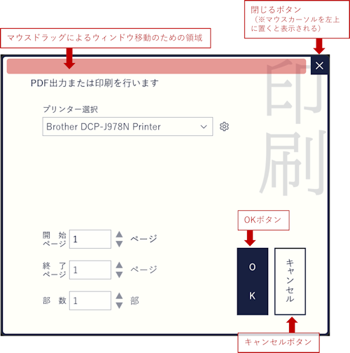 文書の保存確認や印刷ダイアログなど、さまざまなシチュエーションでダイアログが表示されます。独自のデザインを採用していますが、直感的に使用できると思います。キャプションバー(タイトルバー)のようなものはありませんが、ウィンドウ上部をマウスドラッグするとウィンドウの位置を変えることができます。右上にマウスカーソルを置くと閉じるボタンが表示されます。閉じるボタンはキャンセルボタンと同義です。通常のWindowsダイアログと同様、各入力枠のフォーカスをタブキーで移動することができます。