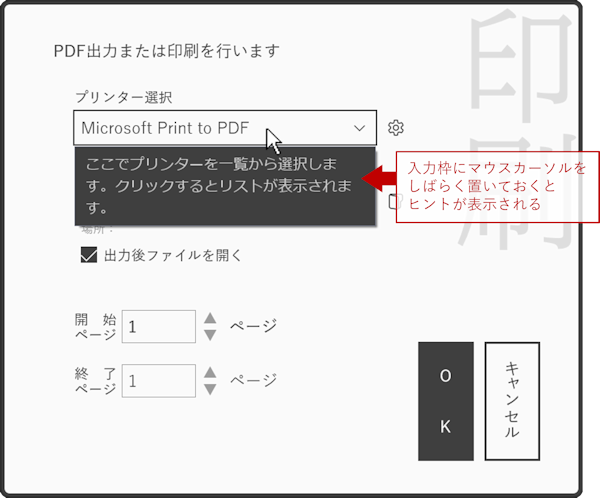 ダイアログでは各入力枠にマウスカーソルをしばらく置いておくとヒントが表示されるようになっています。