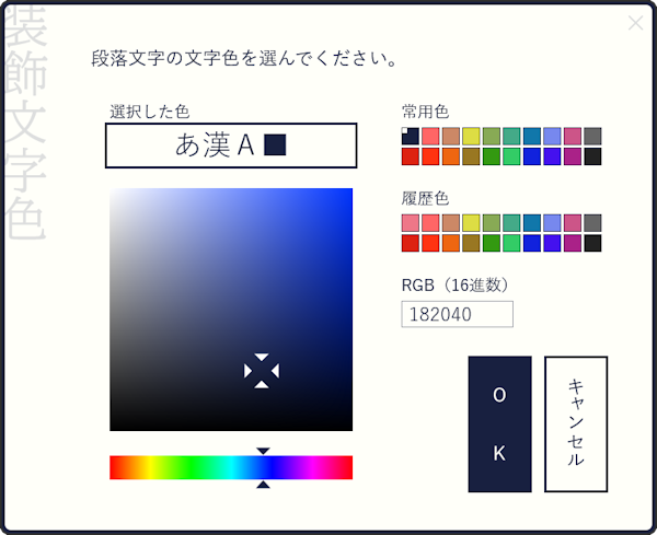 文字の色や背景色などさまざまな色の設定は色ダイアログで行います。
