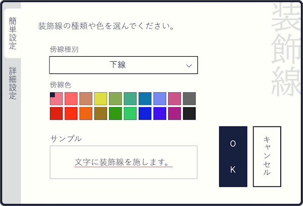 文字の装飾線や区切り線など線の種類や色などを設定するダイアログです。装飾線ダイアログは左側のタブによって2つのページ[簡単設定]と[詳細設定]を切り換えて使用します。簡単設定ではあらかじめ登録された線種(傍線の種類)をリストから選ぶだけで設定することができます。[下線][太下線][二重下線][打ち消し線][二重打ち消し線][鎖線][点線][波線][大波線][マーカー][太マーカー]から選択します。加えて線色を20の常用色から選びます。選択中の常用色には左上に小さな四角形のマークが付いています。下部にはサンプルが表示されますので参考にしてください。